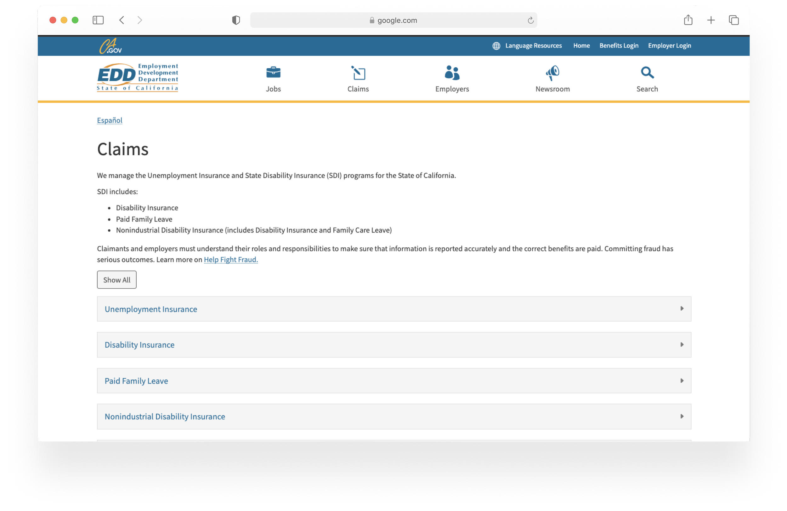While EDD may be helpful to those in need of income, the sites poor navigation masks important information and increases likelihood of users unable to efficiently complete the application process and in turn experience feelings of stress and frustration during a situation that is already anxiety inducing.
